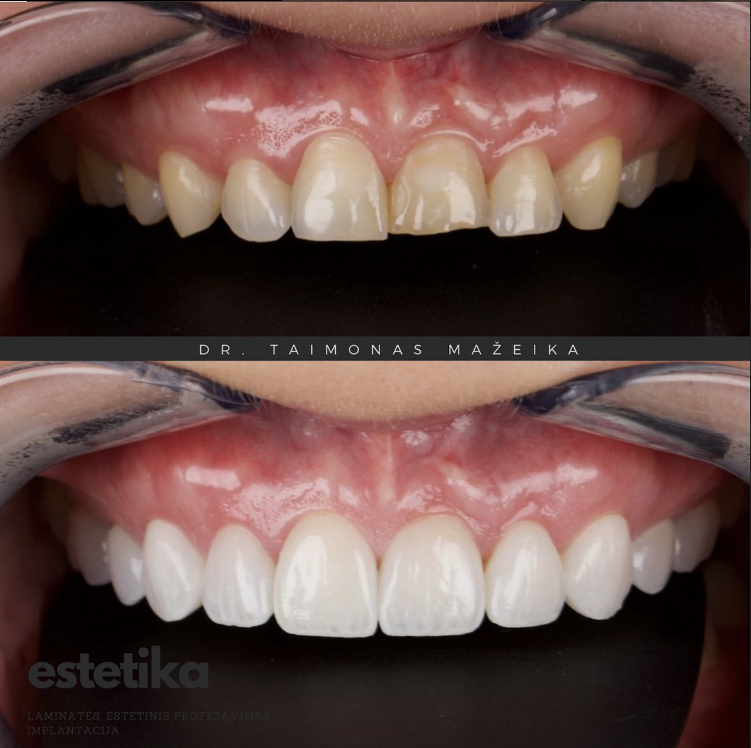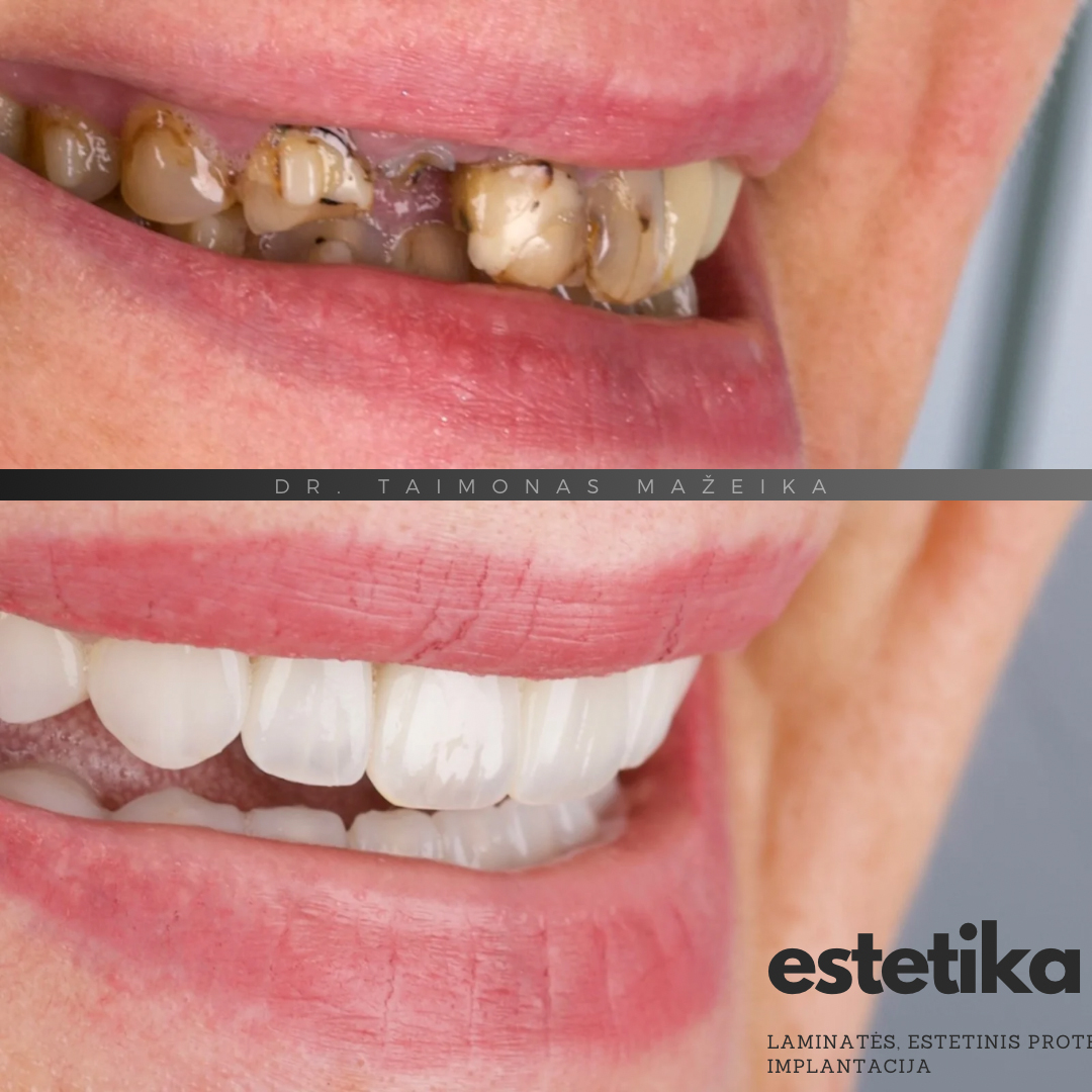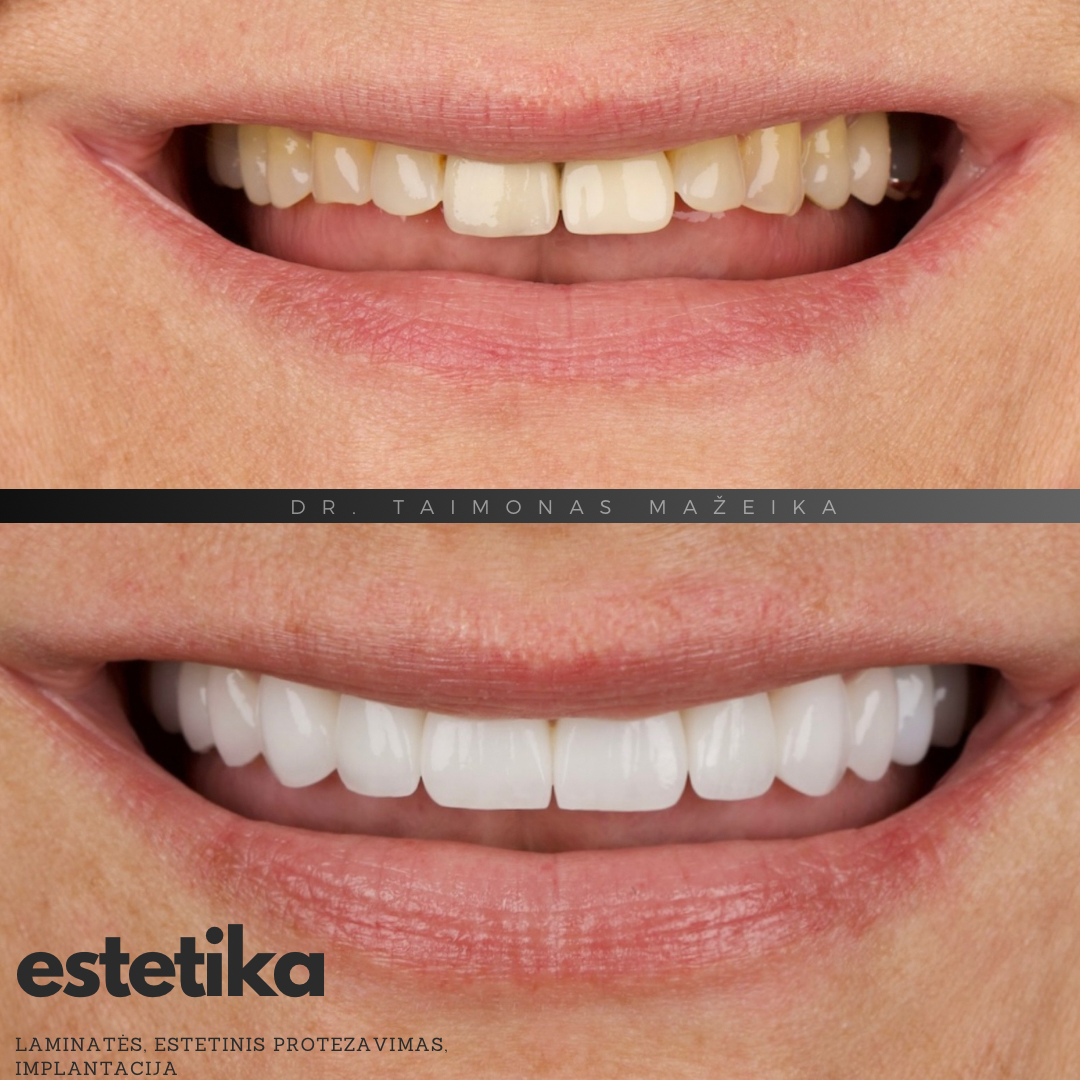 Tai sudėtingesnis atvejis, atskleidžiantis plačias keramikos laminačių pritaikymo galimybes, kai vienu metu galima pagerinti ne tik estetinį vaizdą, bet ir dantų funkciją bei stabilumą. Svarbu paminėti, kad net ir po ortodontinio gydymo kai kuriais atvejais gali prireikti papildomų korekcijų – tiek minimaliai invazinių estetinių, tiek funkcinių, siekiant ilgaamžio ir harmoningai atrodančio rezultato.
