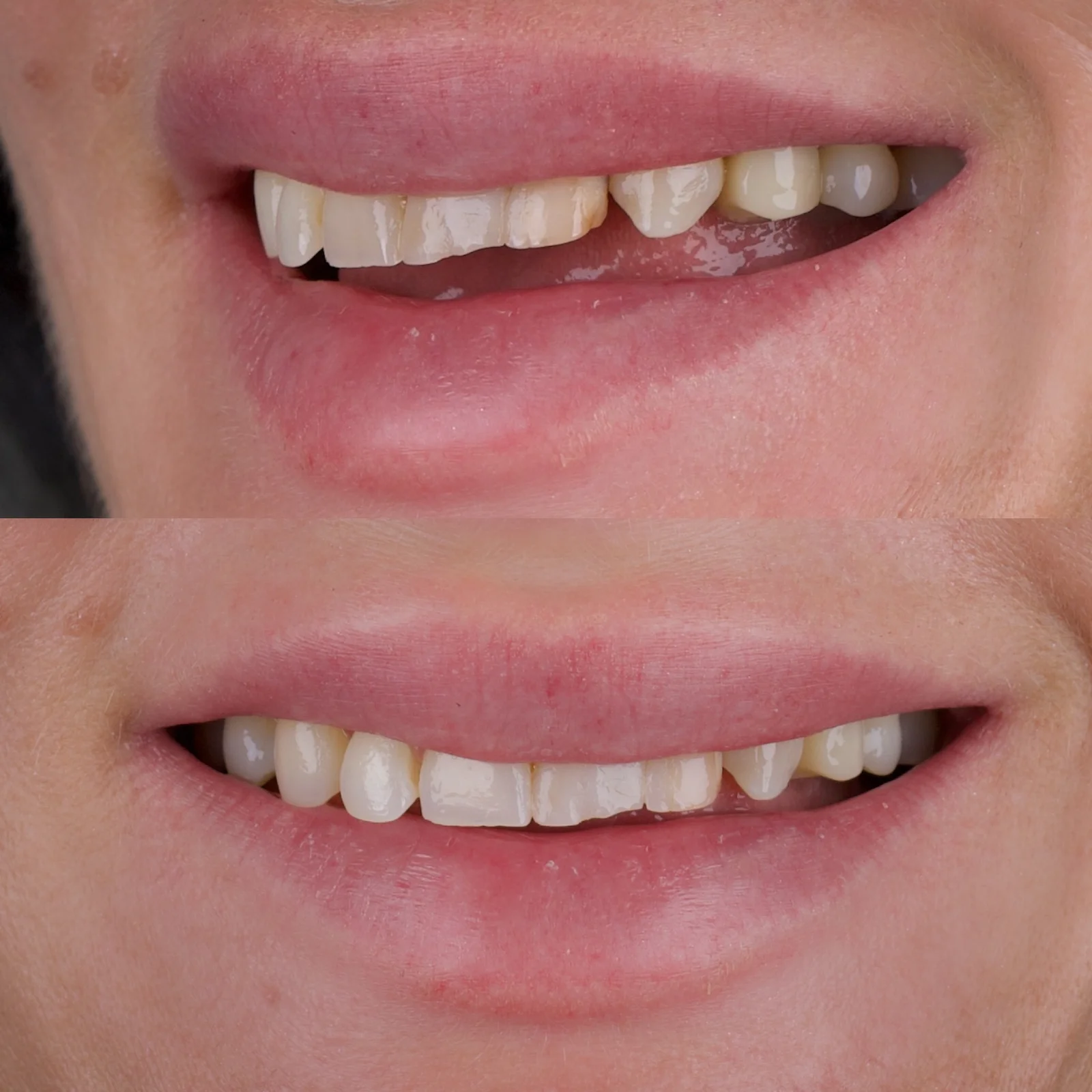 Atlikome dantų anatomijos atkūrimą, pasitelkdami keramikos laminates, leidžiančias vienu metu pagerinti estetiką ir funkciją. Pacientės pageidavimu šypsenai suteikėme natūraliai baltą atspalvį. Taikėme papildomas, minimaliai invazyvias estetines ir funkcines korekcijas, siekdami stabilaus sąkandžio, dantų funkcijos ir harmoningai atrodančio, ilgaamžio rezultato.